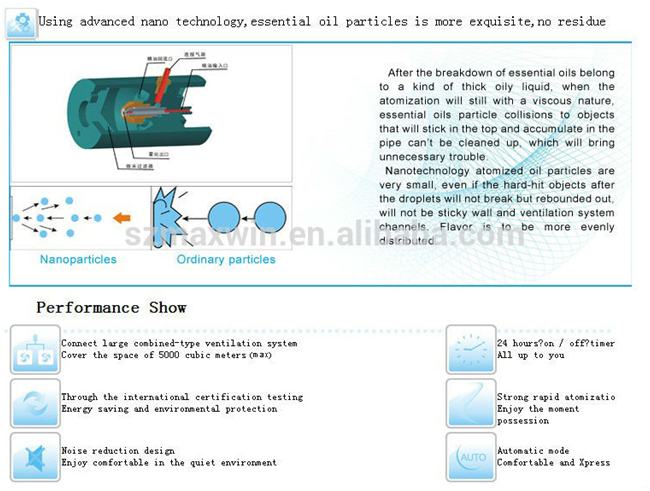 Scent diffuser machine adopts cold two-fluid atomization technology, the high-speed collision of cold air hits aroma oil into nano scale mist, the machine sprays the mist out of the atomizer, the scent flows along through the air.